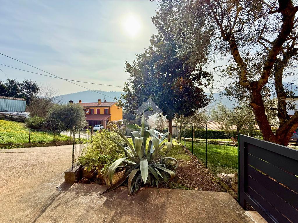 Lo scoperto si divide tra una zona piastrellata, perfetta per parcheggio auto ed una zona verde con un delizioso giardinetto estivo.
