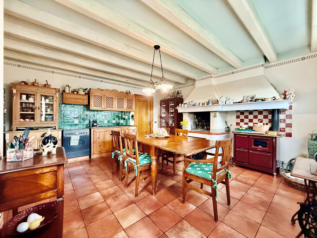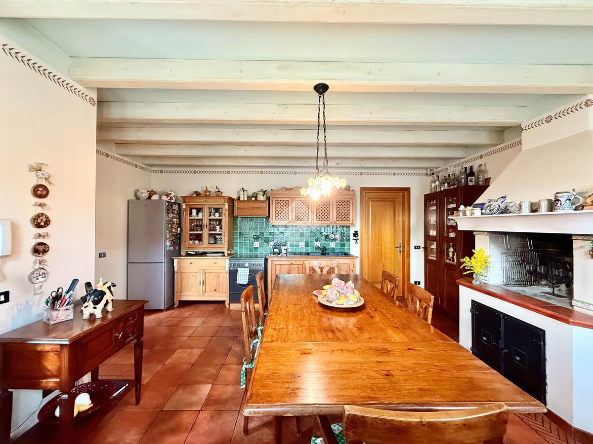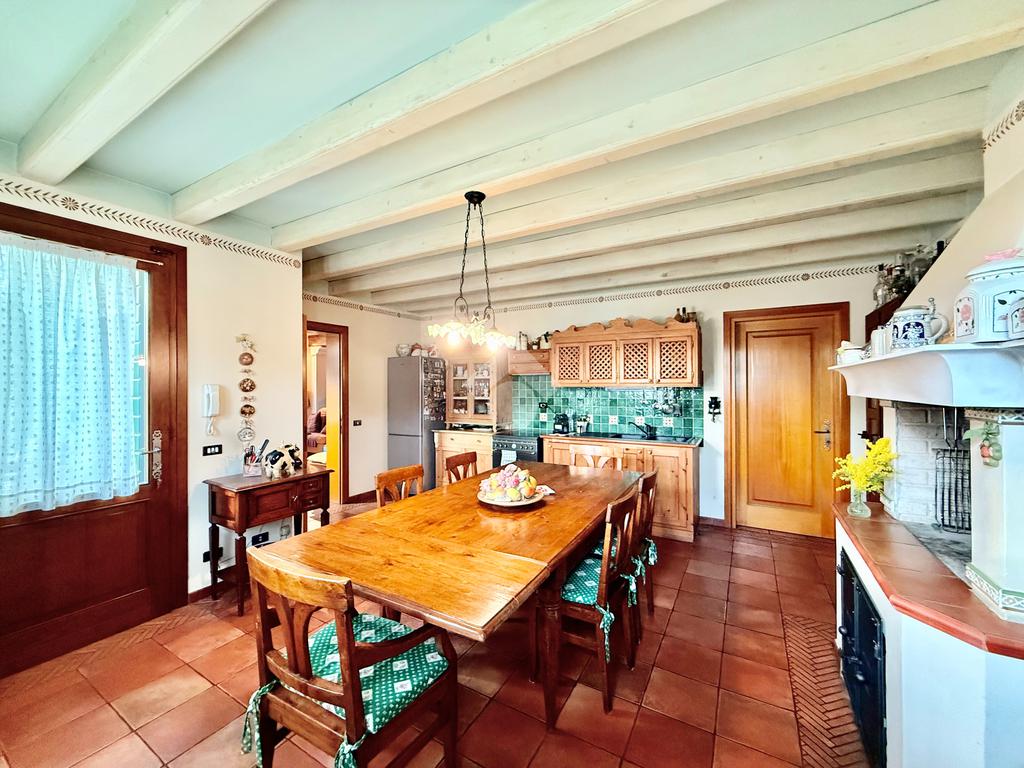 Al piano terra portico che introduce alla zona giorno con salotto impreziosito da camino a legna, cucina abitabile separata con delizioso caminetto e stufa. Nello stesso piano, disimpegno con pratica lavanderia e garage singolo.