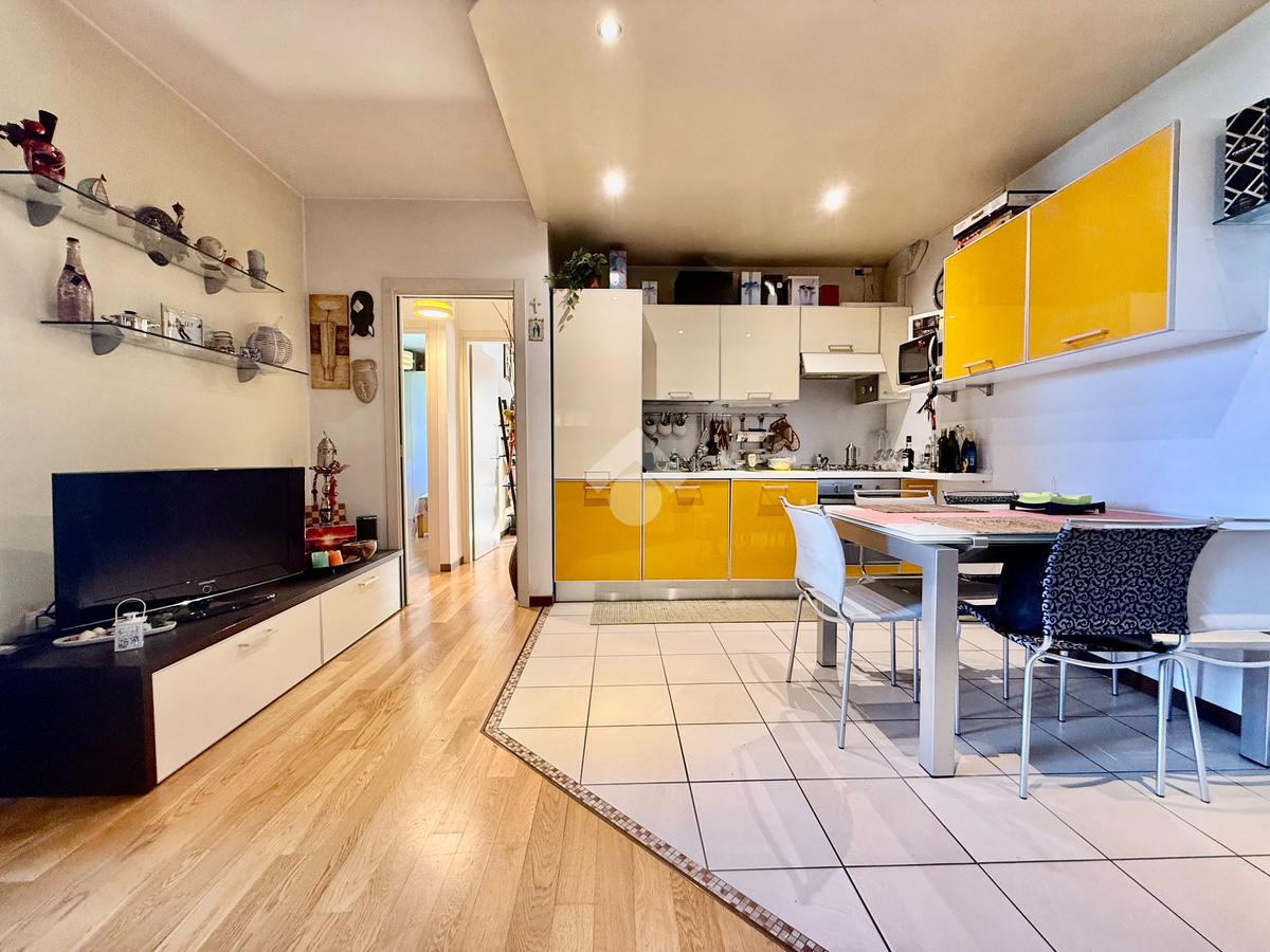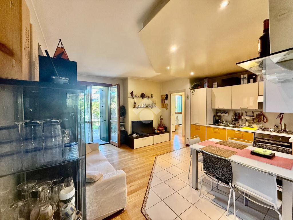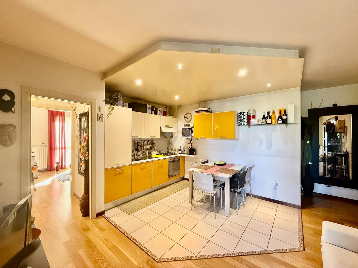 Zona giorno con angolo cottura spazioso con parziale pavimentazione in legno, disimpegno notte, camera matrimoniale, camera singola generosa e bagno finestrato.