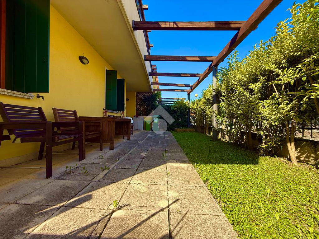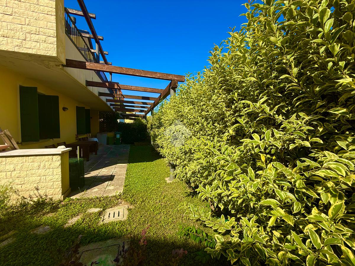 Ingresso indipendente che conduce al giardino privato, dotato di pompeiana esterna e zona relax all'aperto.